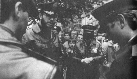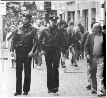 Von der Polizei werden wir übrigens auf unseren Streifgängen in keinster Weise beachtet. Egal wo, auch da, wo Schwarze Sheriffs überhaupt nichts zu suchen haben (etwa im Englischen Garten), nimmt keiner der Polizisten, die uns per Pedes, im Auto oder zu Pferd begegnen, irgendwelchen Anstoß an uns. Erkennen sie uns als Fälschungen? Wohl kaum, und dann wären sie um so mehr verpflichtet, nachzuprüfen, was es mit diesen finsteren, offen Waffen tragenden Gestalten auf sich hat. Mager und Konitzer als Kleinstbürgerwehr.