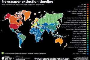 Jetzt wissen wir es endlich genau. Der amerikanische – selbsternannte – Futurist und Strategieberater Ross Dawson hat es in seinem Blog gewagt, das Ableben der Zeitungen in ihrer gedruckten Form (engl. „newspaper„) weltweit exakt zu terminieren. Das geht 2017 in den USA los, 2019 folgt Großbritannien, 2020 Kanada und Norwegen. Deutschland hat seiner Meinung nach noch eine Galgenfrist bis ins Jahr 2030. Ganz am Ende der Entwicklung stehen die Mongolei (2038), Argentinien (2039) und das komplette Afrika (2040+). (Die komplette Weltkarte dazu ist beigefügt.)