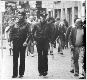 So marschierten wir dann zu verschiedenen Gelegenheiten durch das Zentrum Münchens und erlebten ein Stück Realsatire, wie wir sie uns selbst nicht erwartet hatten. Wir erlebten die einschüchternde Wirkung von Uniform und Patrouillen-Attitüde und die kleine Faschistoidität einer Großstadtgesellschaft (der 80er-Jahre) samt Polizeieinsatz gegen die (selbsternannten) Ordnungshüter.